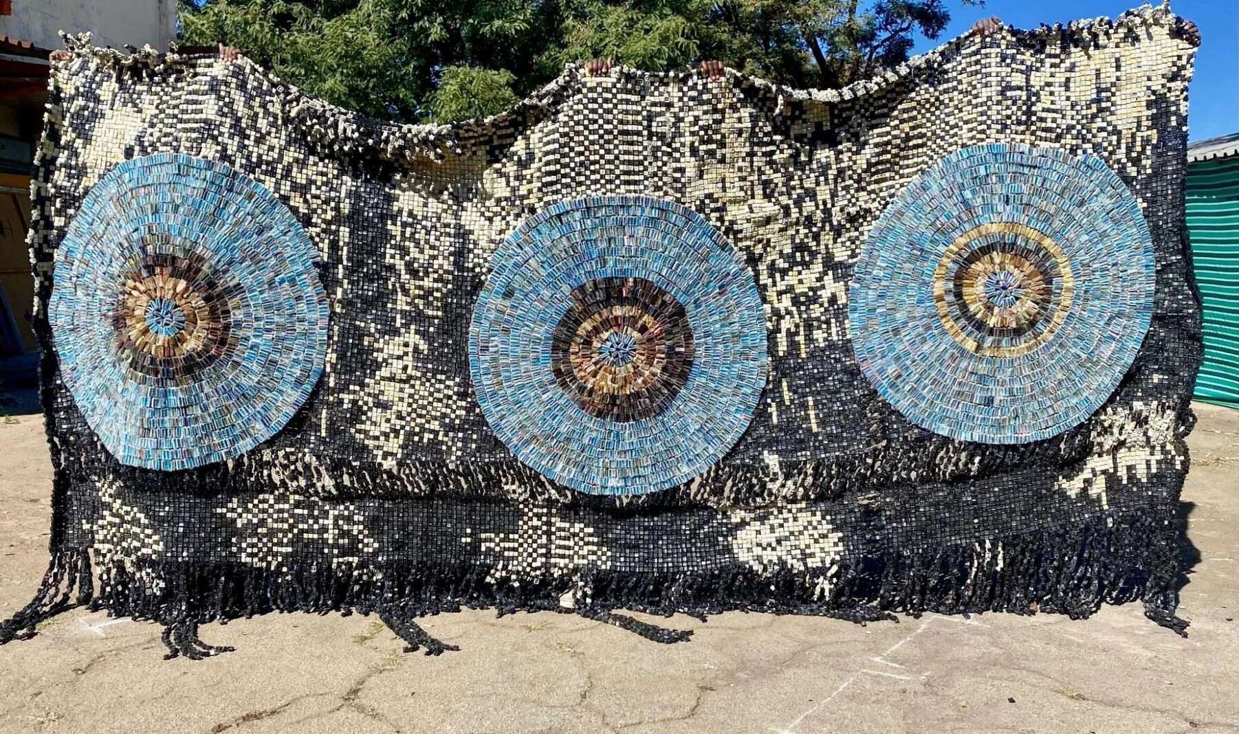 Born in Karoi, Zimbabwe, Takadiwa currently lives and works in Harare. He specializes in large-scale sculptural pieces, often using discarded materials, including plastic bottles, spray cans, computer waste, even toothbrushes and razors - anything that catches his eye. He quite literally 'weaves' these elements into huge organic forms, evocative of opulence and modern grandeur. A recent review describes Takadiwa's work as creating the illusion of something "jewel-encrusted," "excessive," "a ritualistic kind of minimalism."